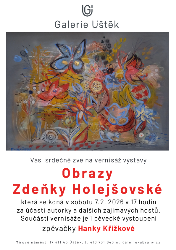 Srdečně vás zveme na slavnostní zahájení první letošní výstavy obrazů malířky Zdeňky Holejšovské. Vernisáže se v sobotu 7.2. v 17 hodin účastní autorka a další zajímaví hosté. Na výstavě představíme průřez její tvorbou z poslední doby. Zdeňka se věnuje malbě olejem i akrylem a ke zvýraznění svých motivů využívá i zlato. Nejen díky tomu se jako jedna z mála autorek prosadila se svými obrazy v Japonsku i v Argentině. Jedním ze vzácných hostů sobotního večera bude i vynikající zpěvačka Hanka Křížková, která si pro nás připravila zajímavé pěvecké vystoupení. Máme se po všech stránkách na co těšit.