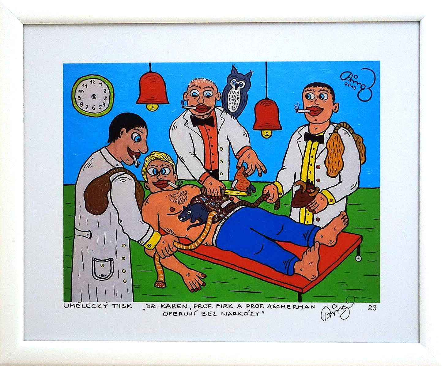 Úvod > František R. Čech > Umělecké tisky - všechny > František R. Čech - Dr. Karen, prof. Pirk a Aschermann operují bez narkózy - signovaný umělecký tisk v rámu