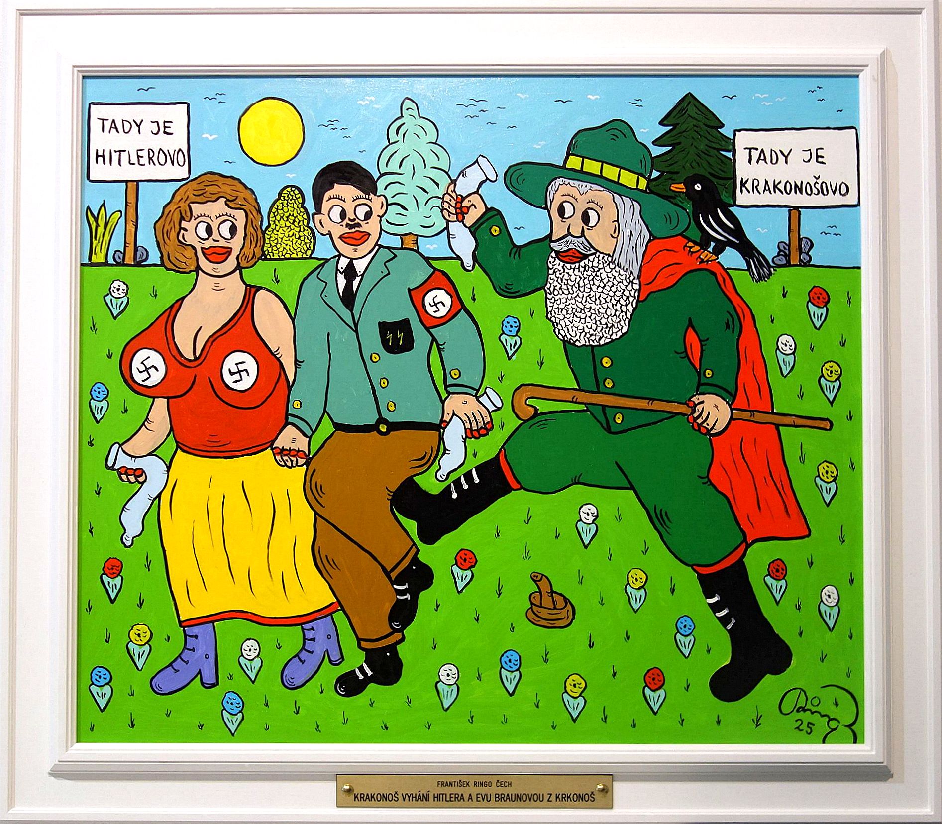 Úvod > František R. Čech > Olejomalby > František R. Čech - Krakonoš vyhání Hitlera a Evu Braunovou z Krkonoš - originál