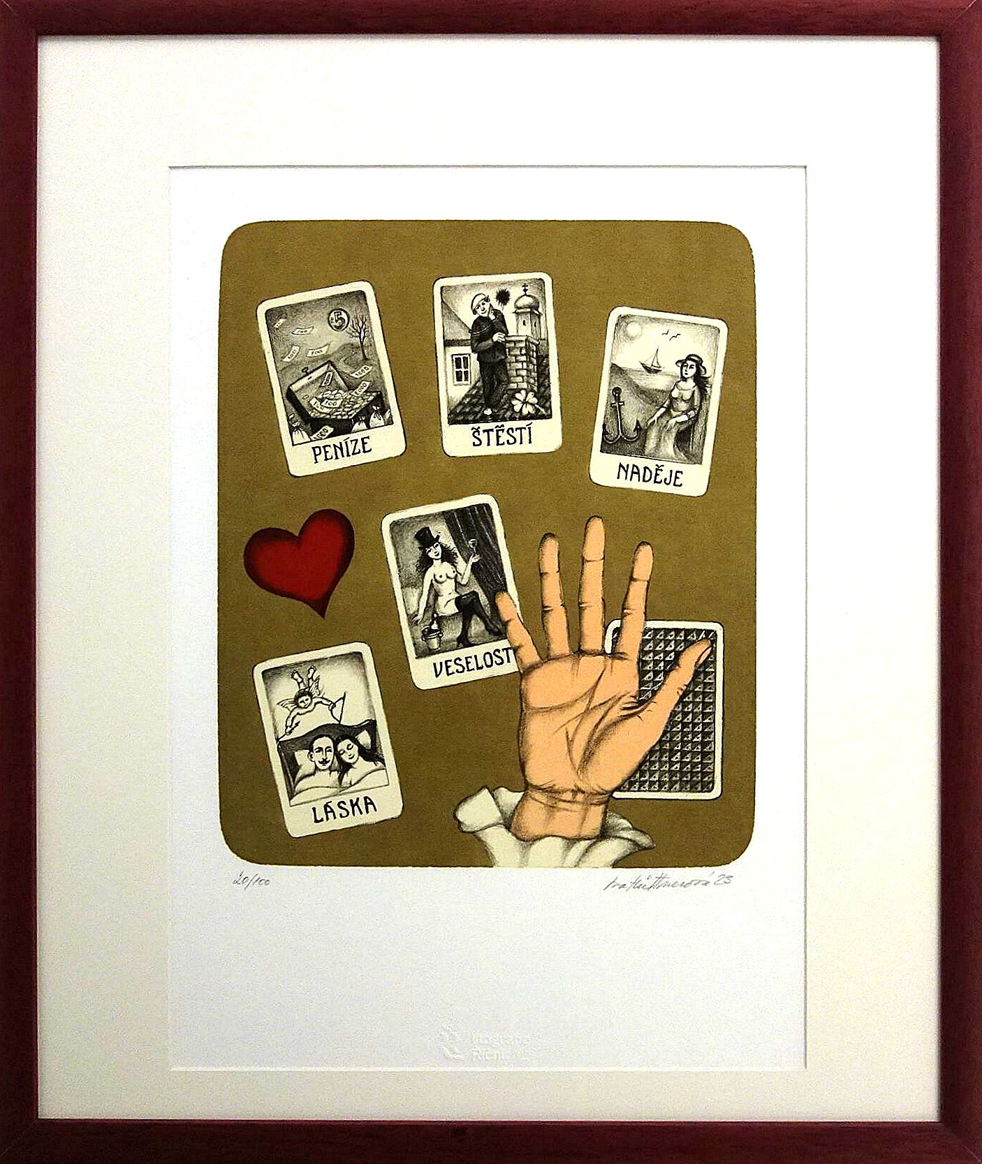 Rozměry včetně rámu: 49x58 cm. Technika: litografie, č. 20/100. Rám/pasparta.