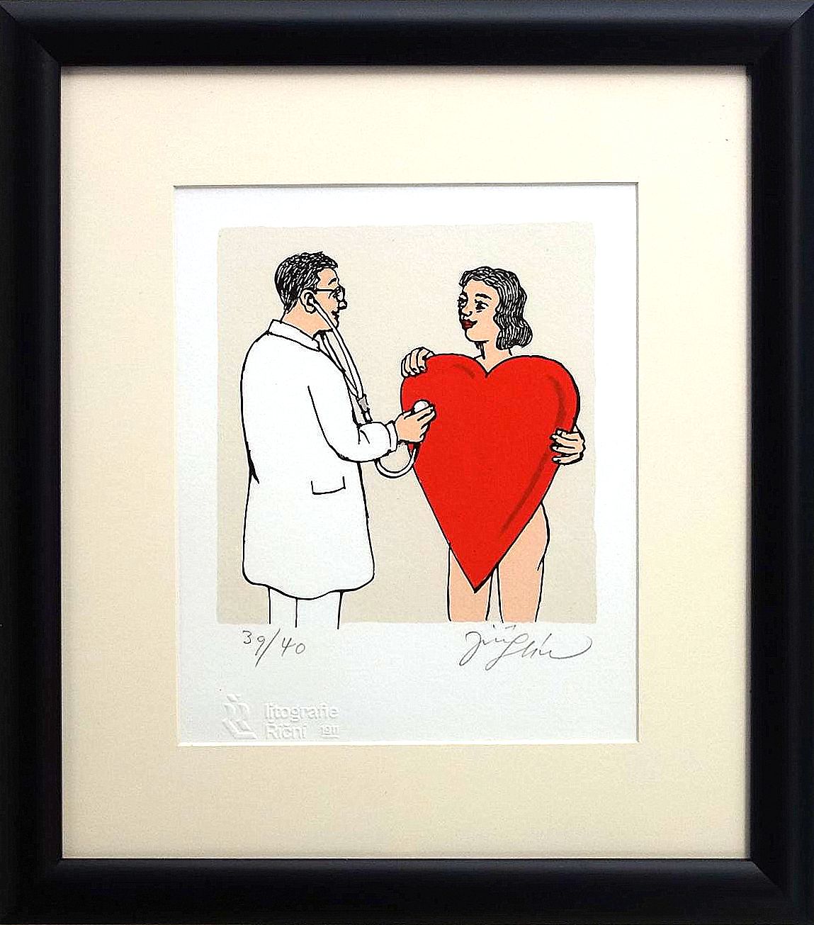 Rozměry včetně rámu: 31x35,5 cm. Technika: litografie, č. 39/40. Rám/pasparta.