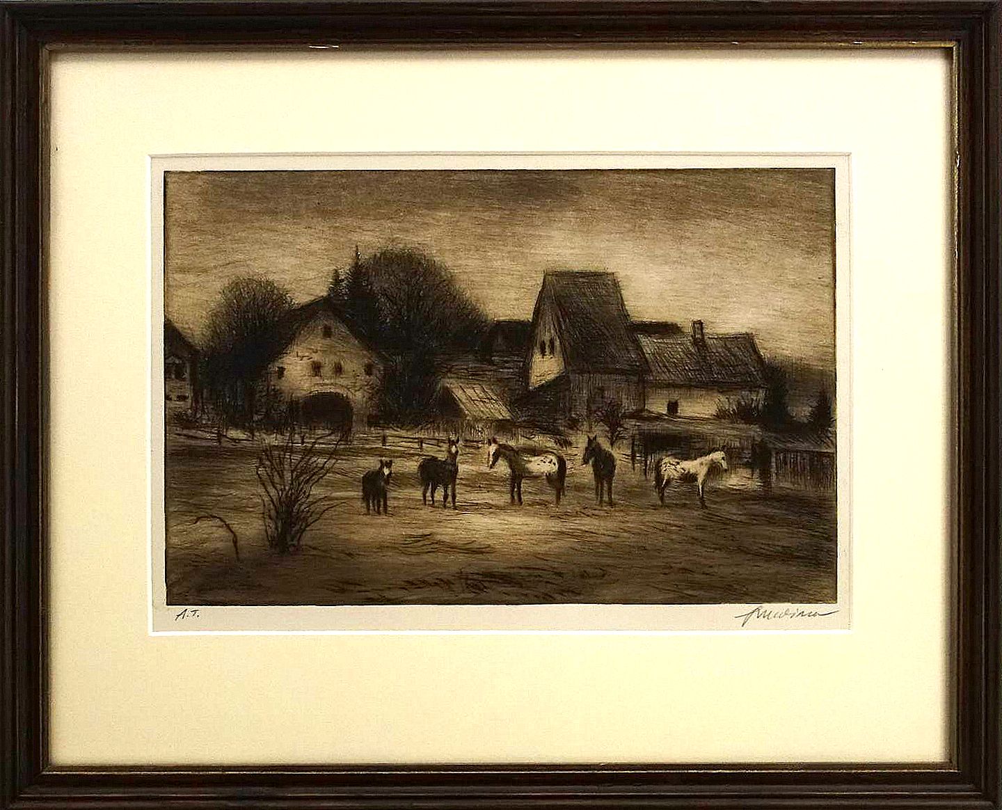 Rozměry včetně rámu: 33x41 cm. Technika: suchá jehla, A.T. Rám/pasparta.
