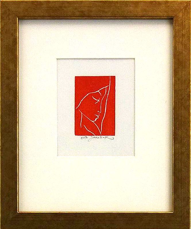 Rozměry včetně rámu: 21,5x26 cm. Technika: linoryt. Rám/pasparta.