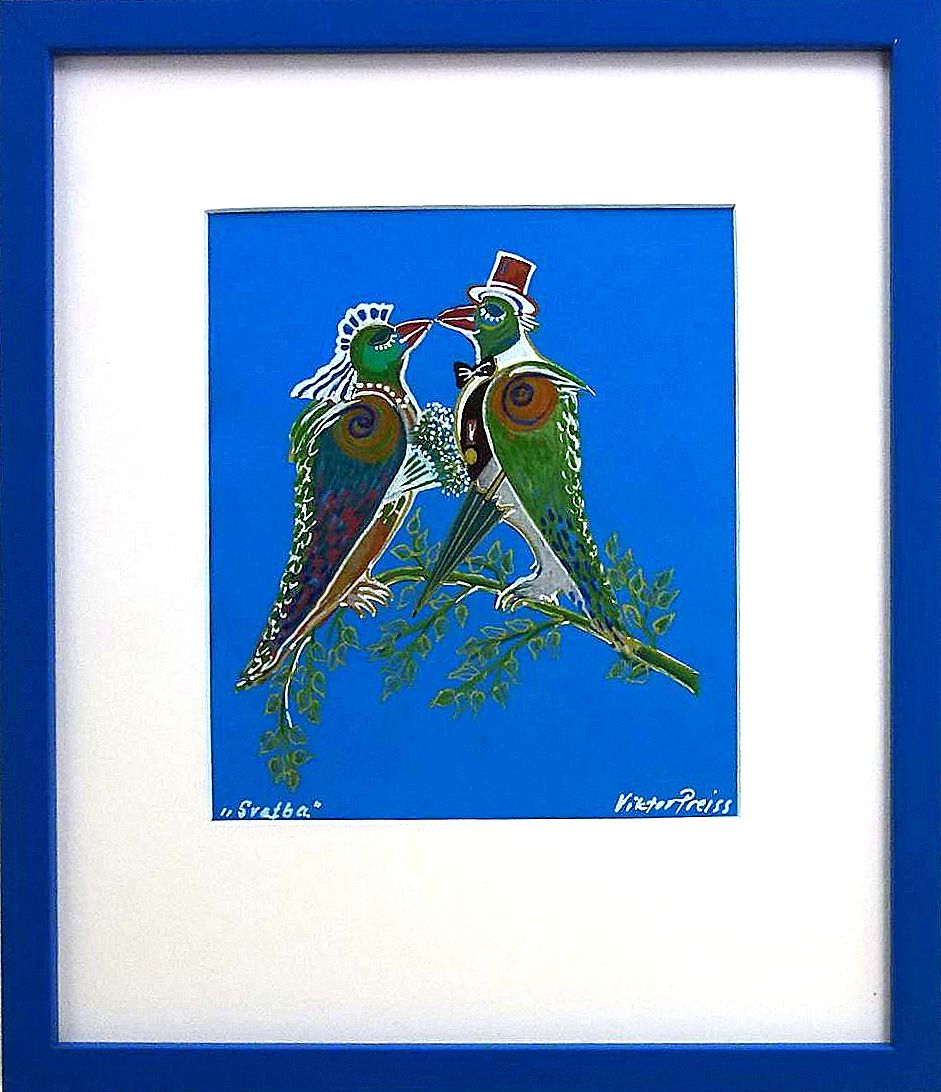 Rozměry včetně rámu: 27x32 cm. Technika: kolorovaná kresba. Rám/pasparta.